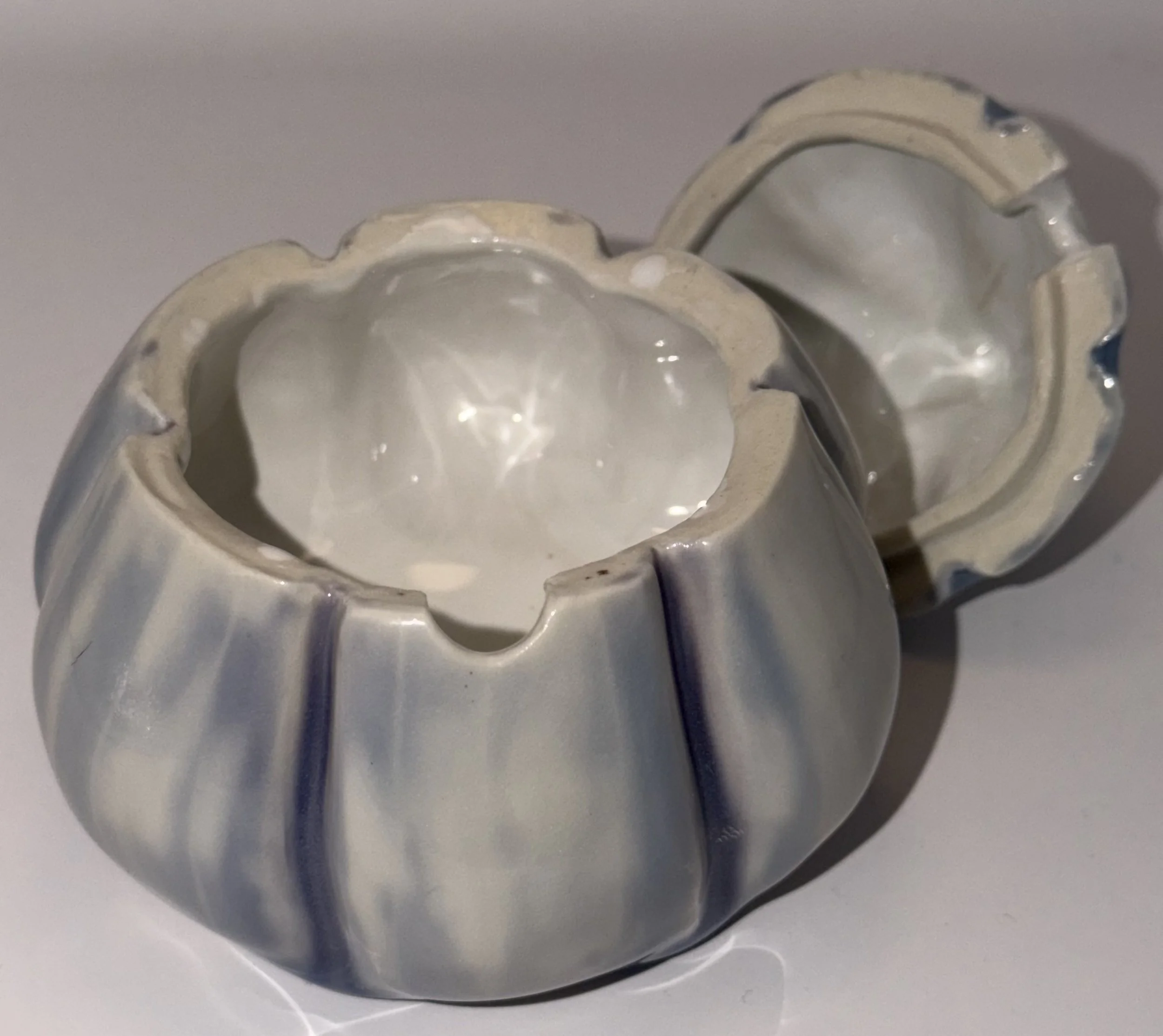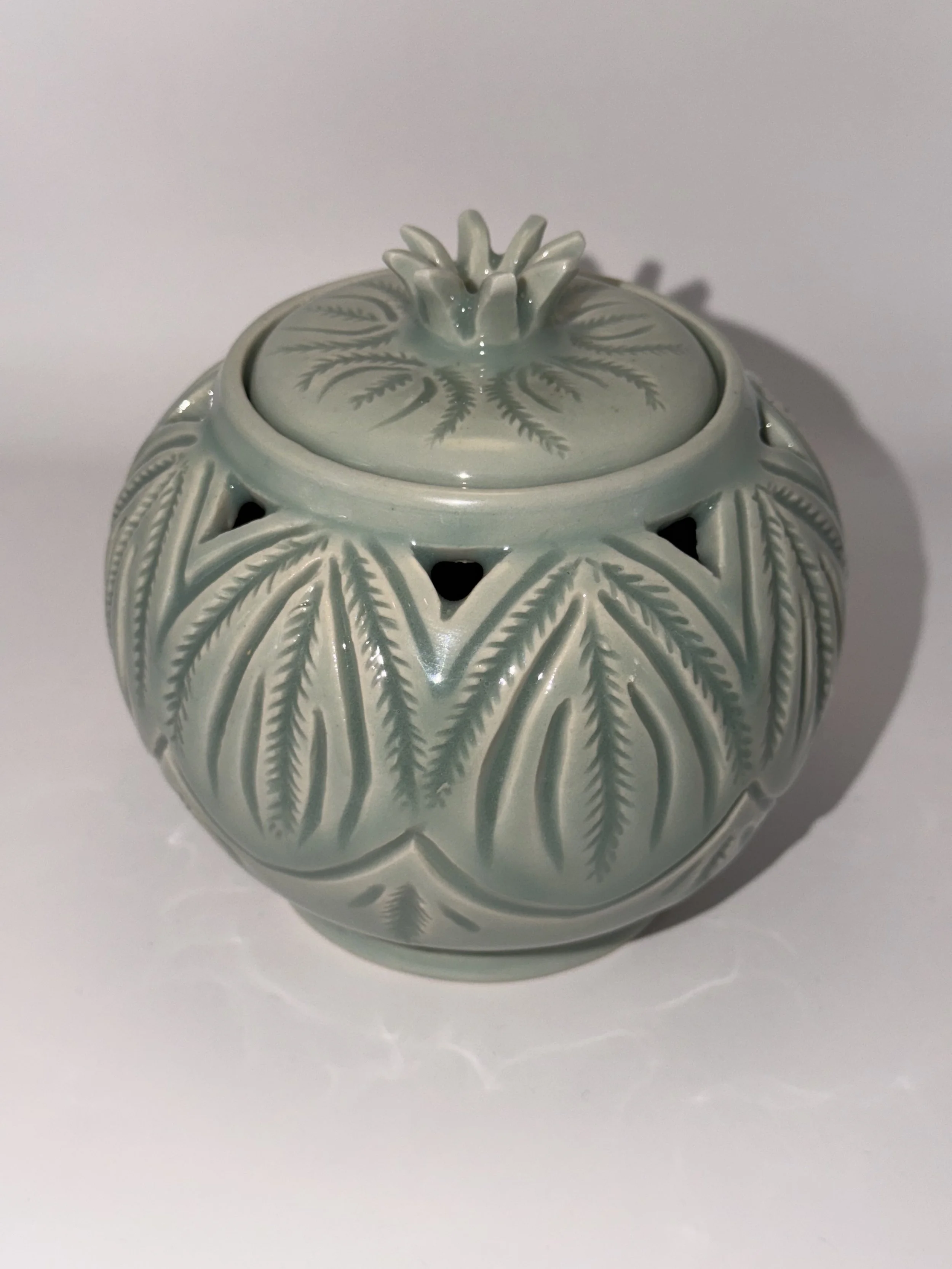 Meet my all time favorite pot. Beautiful aqua celadon glaze pools in the carvings and around the crown knob of the lid. Cut-outs make it light and give dimension.